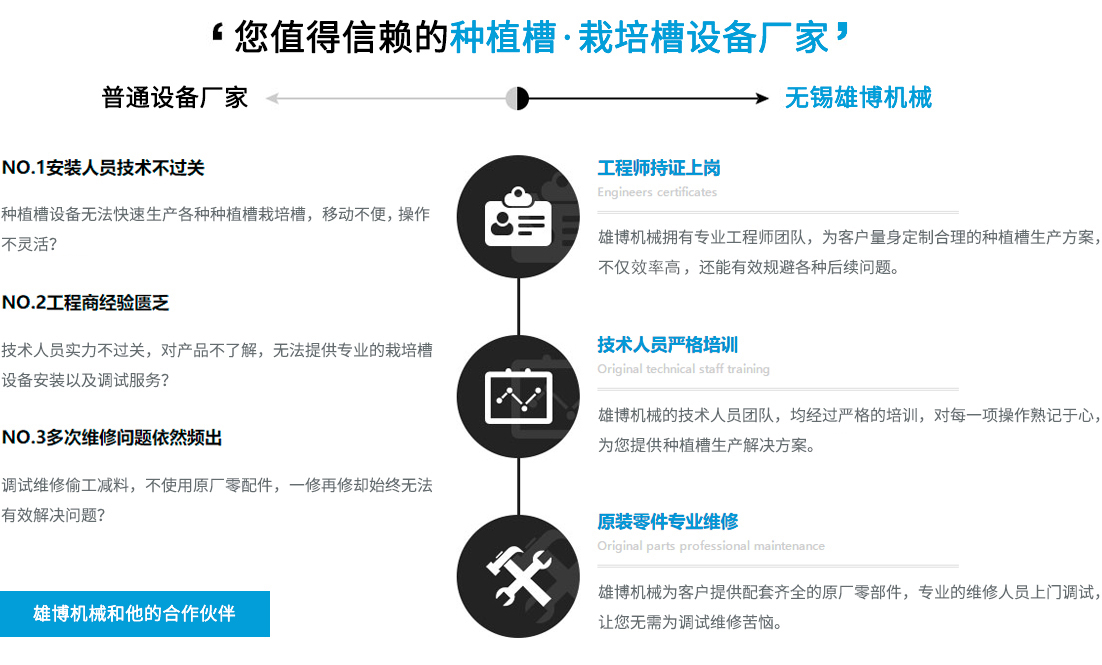 您在選擇雄博產品的同時,也選擇無微不至的終身服務??筛鶕煌蛻魧嶋H需求進行種植槽設備,栽培槽設備等的特殊工藝設計制造專業(yè)一對一售前/售后/技術咨詢指導,享受更貼心/放心的設備使用體驗。